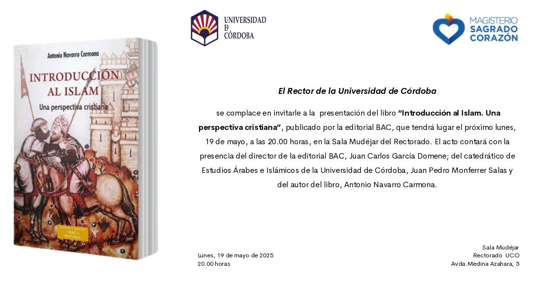 D. Antonio Navarro Carmona profesor del ISCCRR Beata Victoria Díez, presenta el libro «Introducción al Islam, Una perspectiva cristiana», publicado por la editorial BAC, el próximo lunes 19 de mayo, alas 20:00 h, en la Sala Mudéjar del Rectorado (Avd. Medina Azahara 5). El acto contará con la presencia del director de la editorial BAC, Juan Carlos García Domene; del catedrático de Estudios Árabes e Islámicos de la Universidad de Córdoba, Juan Pedro Monferrer Salas y el autor del libro, Antonio Navarro Carmona. La entrada es libre hasta completar aforo.
